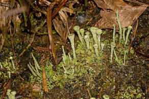 Meist etwa bis 2,5cm hoch, graugrün, Becher mit braunen Pyknidien und selten ausgebildeten Apothecien.