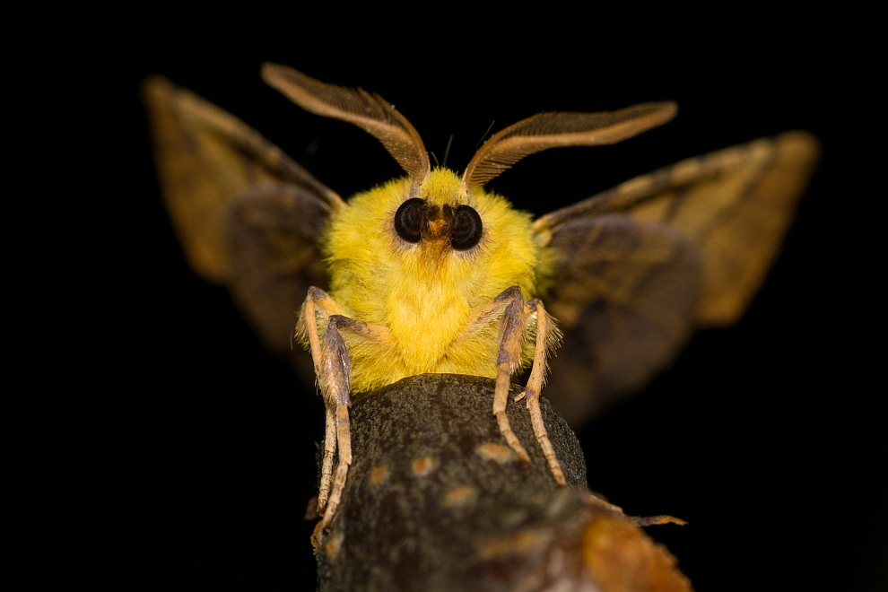 Die Flügel sind gelblichbraun mit zwei schmalen, dunklen Querlinien; auffälligstes Merkmal ist die leuchtend zitronengelbe Thoraxbehaarung.