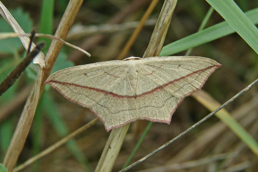 In D* unverkennbar; Körper, Vorder- und Hinterflügel beige bis (hell-)ockerfarben; über die Flügel verläuft ein deutliches, rötliches Querband und am Vorderrand der Vorderflügel befindet sich ein kleiner dunkler Punkt - mit etwas Phantasie erinnert diese Zeichnung an ein "Gesicht"; die Flügel haben zudem eine charakteristische geschwungene und in "Spitzen" endende Form.