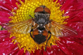 schwarzgrau, manchmal mit bläulichem Glanz; Hinterleib orange, in der