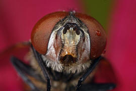 von der Basis nach hinten zwei dunkle Striemen; Augen groß, rot, auf der