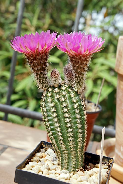 Echinocereus reichenbachii mit seinen wunderschönen und großen Blüten ist eine Zier für jede Kakteensammlung. Es gibt sowohl winterharte als auch nicht winterharte Auslesen. Ich habe eine winterharte Auslese die Temperaturen bis etwa -20°C vertragen soll. Das Substrat muss gut durchlässig sein. Ich verwende eine Mischung aus Lehm und mineralischem Substrat. Als Standort kommt nur ein vollsonniger, regengeschützter Platz in Frage - am besten im Freien. Nach der Winterruhe sollten die Pflanzen bei einer absehbaren Schönwetterperiode schon ab Ende März / Anfang April gegossen werden damit sich die über den Winter geschrumpften Pflanzenkörper wieder vollsaugen können. Ab Mai kommen dann die ersten Düngergaben, bei sonnigem, warmen Wetter das Substrat gleichmäßig feucht halten - nur bei anhaltendem schlechtem Wetter nicht gießen. Ab etwa Ende August die Wassergaben reduzieren und bis Mitte September dann völlig einstellen. Die Pflanzen müssen schrumpfen. Winterharte Sorten bleiben am besten völlig regengeschützt im Freien (Frosthärte der Pflanzen beachten), nicht winterharte müssen an einen sehr kühlen (4-8°C) Ort gestellt werden. Die Anschaffung dieses schönen Kaktus lohnt nur, wenn man geeignete Standorte für Sommer und Winter gewährleisten kann. Zu wenig Sonne oder ein zu warmer Winterstand führen zu unschönen Pflanzen die nicht blühen. |