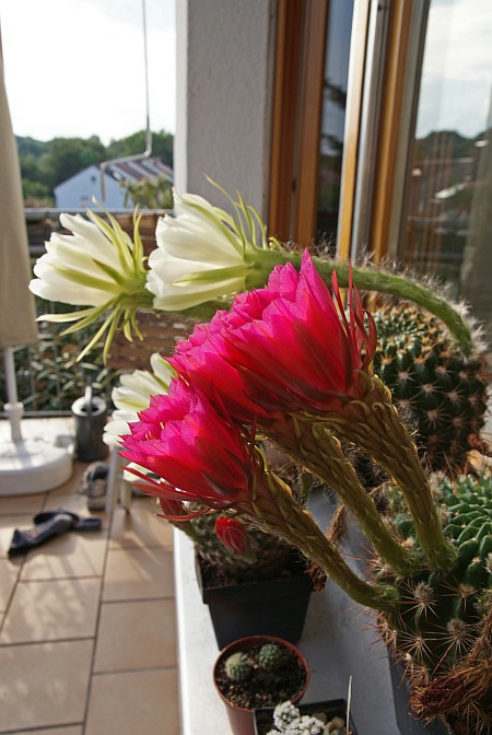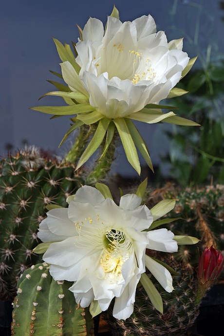 Echinopsis Hybriden mit ihren herrlichen Blüten pflanzt man am besten in eine Mischung aus mineralischer, humoser und sandiger Erde. Ein vollsonniger Standort ist empfehlenswert. Die cremeweißen Blüten dieser Hybride öffnen sich nur für eine Nacht und einen halben Tag. Je nach Temperatur reicht die Blühdauer von etwa 23 Uhr bis 13 Uhr des Folgetages. Nach der kühlen (8-12°C) und absolut trockenen Überwinterung an einem hellen Platz die Pflanzen ab etwa Ende April (je nach Witterung) morgens an sonnigen Tagen etwas nebeln - nicht gießen. Erst wenn die Blütenknospen gut entwickelt sind darf gegossen werden - dann aber reichlich und auch ein Schuss Kakteendünger sollte nicht fehlen. Während der Wachstumsphase das Substrat mäßig feucht halten und ab und zu düngen (nach Herstellerangaben). Ab September die Wasserangaben reduzieren und das Düngen einstellen und schließlich von Ende Oktober bis zum nächsten Frühjahr völlig trocken halten.