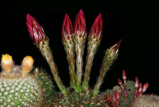 Echinopsis kermesina mit ihren herrlichen Blüten pflanzt man am besten in eine Mischung aus mineralischer, humoser und sandiger Erde. Ein vollsonniger Standort ist empfehlenswert. Die Blüten halten nur etwa zwei Tage, aber mit etwas Glück blüht die Art mehrmals im Sommer (ich weiß leider nicht, was zu diesen Nachblüten führt). Nach der kühlen (8-12°C) und absolut trockenen Überwinterung an einem hellen Platz die Pflanzen ab etwa Ende April (je nach Witterung) morgens an sonnigen Tagen etwas nebeln - nicht gießen. Erst wenn die Blütenknospen gut entwickelt sind darf gegossen werden - dann aber reichlich und auch ein Schuss Kakteendünger sollte nicht fehlen. Während der Wachstumsphase das Substrat mäßig feucht halten und ab und zu düngen (nach Herstellerangaben). Ab September die Wasserangaben reduzieren und das Düngen einstellen und schließlich von Ende Oktober bis zum nächsten Frühjahr völlig trocken halten. |