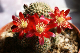Rebutia gibbulosa ist eine klein bleibende, stark sprossende Kakteenart die vergleichsweise leicht zu pflegen ist. Das Substrat am besten mineralisch mit etwas Humus. Im Frühjahr, je nach Witterung ab etwa April, bei schönem Wetter morgens mit warmem Wasser besprühen um das Wachstum anzuregen und etwa ab Mai gießen. Rebutien benötigen in der Wachstumsphase eine gleichmäßige Bodenfeuchte und regelmäßige Düngergaben (Kakteendünger). Der Standort vollsonnig, am besten im Freien. Viel Sonne und Luftbewegung sorgen für kräftige Pflanzen. Ab etwa September die Wassergaben reduzieren und das Gießen ab Mitte Oktober ganz einstellen. Rebutien sollten auch im Herbst solange es geht (frostfrei!) im Freien verbleiben, die Überwinterung dann absolut trocken, so hell wie möglich bei 2-10°C. Meist blühen diese Pflanzen ab Mitte / Ende Mai, bei bestmöglicher Pflege überreich. Die roten Blüten halten etwa 2-3 Tage, die Blütezeit an sich erstreckt sich bei gutem Blütenansatz über 2-3 Wochen.
