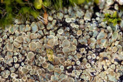 Bis 10cm große, rundliche Lager von graugrüner bis blassgrüner Farbe, dicht an den Untergrund geschmiegt; in der Mitte dicht mit Apothecien bedeckt, diese mit hellem Rand; Läppchen am Rand ebenfalls hell gesäumt.
