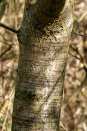 Strauch oder Baum, bis 25m hoch, Rinde bei jungen Bäumen glatt, glänzend grau- bis  rotbraun, mit quer verlaufenden Korkleisten, alte Bäume mit längsrissiger, schwarzgrauer Borke, Krone kegelförmige; Blätter länglich bis herz-eiförmig, etwa 6-14cm lang, gesägt; Blüten lang gestielt, weiß, bis 30mm Ø, zu 2-5 in Büscheln,  Blütezeit etwa von April bis Anfang Juni.