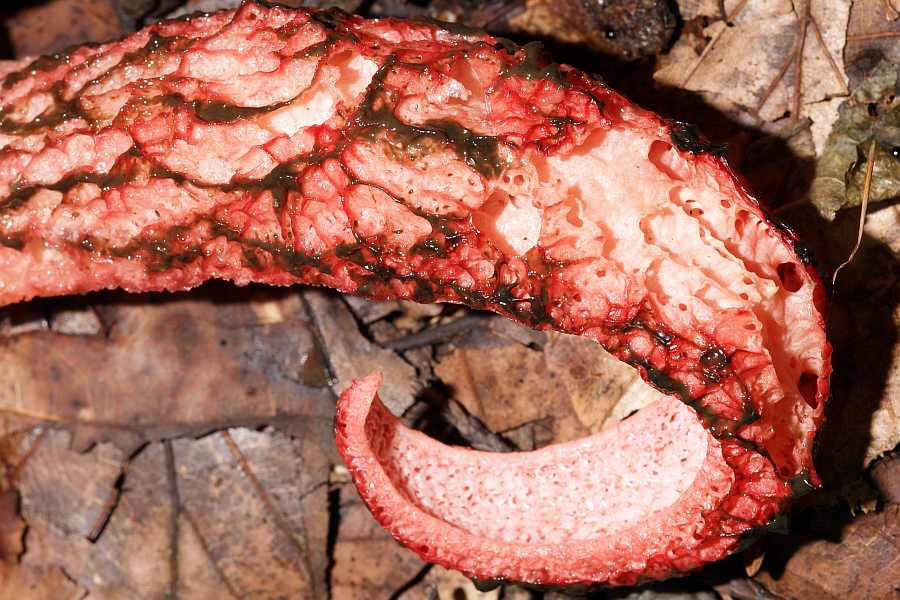 bräunlichgrüner, schleimiger, netzartiger Fruchtmasse