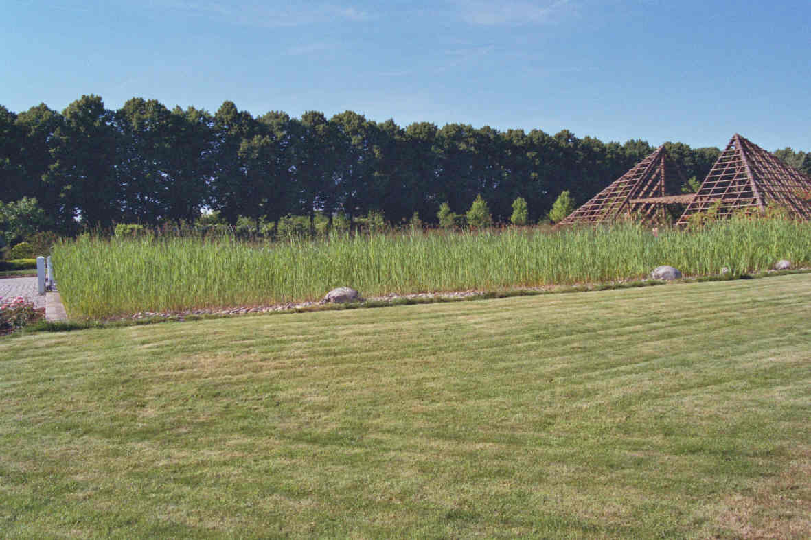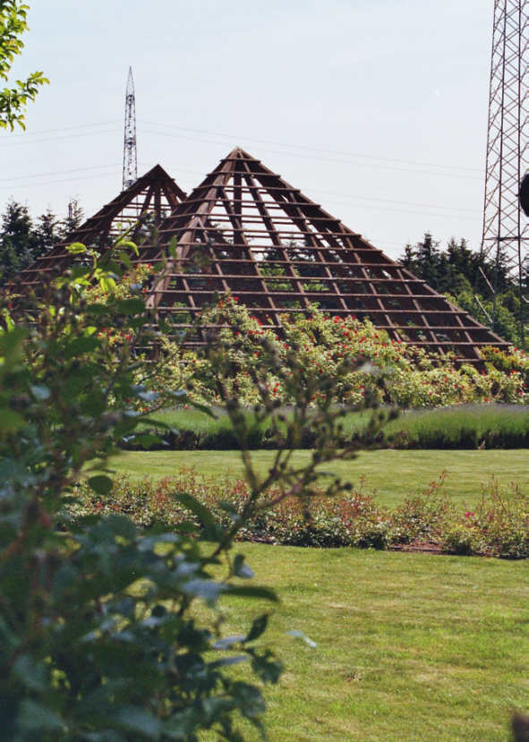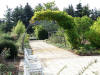 kurzer, von einigen Rosenpyramiden gesäumter, Weg direkt zum Rosarium. Sie