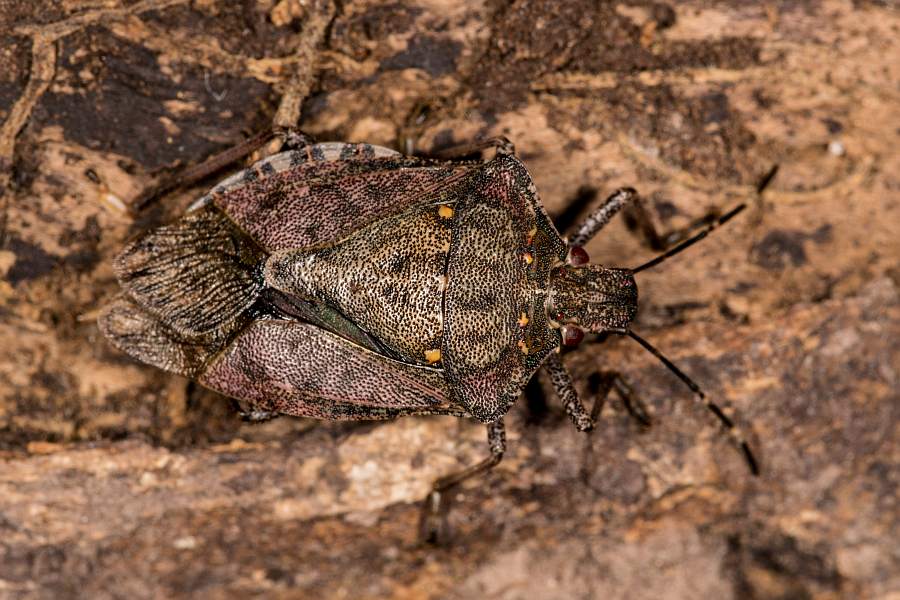 Die Marmorierte Baumwanze überwintert als Imago. Im Herbst, wenn es kühler wird, sieht man die Tiere häufiger an von der Sonne erwärmten Hauswänden. Nicht selten verirren sie sich zu dieser Zeit in Wohnungen. Ein vermeintlich geeignetes Winterquartier. Aber in beheizten Wohnungen kann weder diese, noch eine andere Baumwanzenart den Winter überleben. Also einfach einfangen und an die frische Luft bringen.